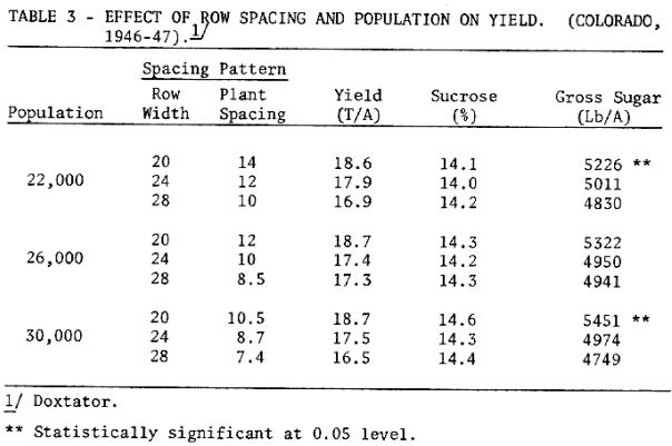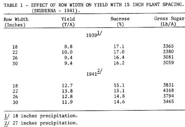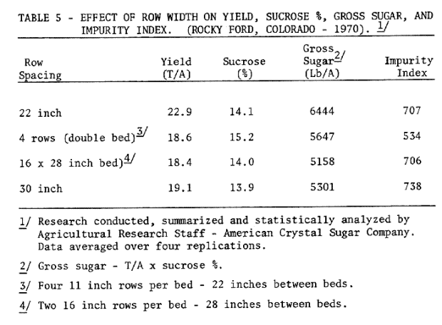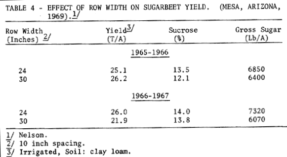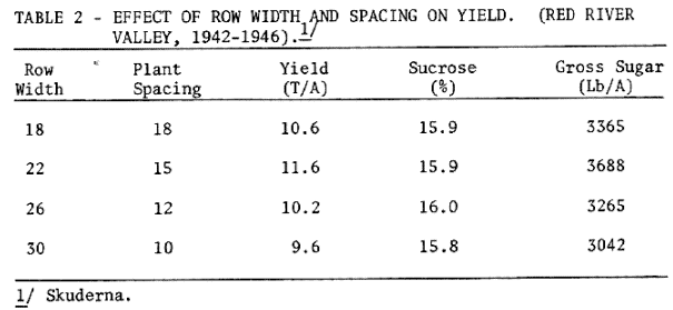 - Increasing row width from 20 to 24 inches reduced sugar yields 400 pounds/acre (1946).