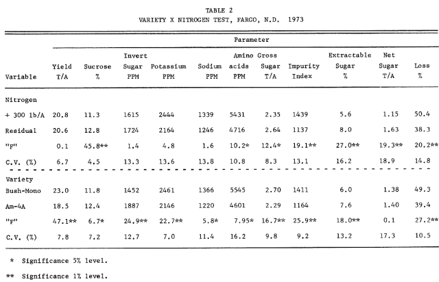 Fertility effects (high nitrogen) are shown on two varieties (Table 2). The residual nitrogen level (150 lb/A at planting) appeared to be adequate for maximum yields since no significant differences were detected at harvest. However, the high N level caused a significant reduction in the amount of extractable sugar due to high levels of impurities and lower sucrose levels.