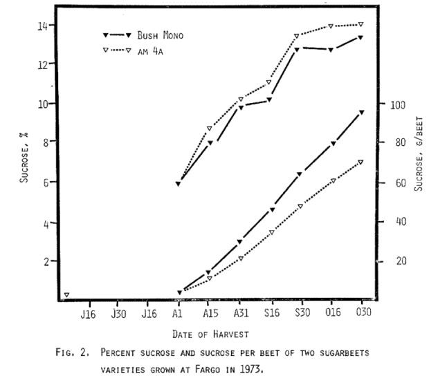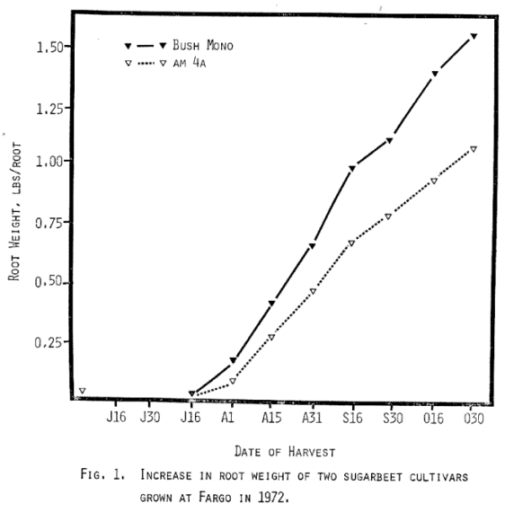 The growth rates of two cultivars were studied this past summer at Fargo (Fig. 1 and Fig. 2). Seed were planted on June 4 and harvests were made twice monthly beginning the middle of July. The data shows that Bush-Mono had a faster growth rate than Am-4A but a lower percentage of sucrose. However, total sucrose per beet was greater for Bush-Mono due to the larger root.