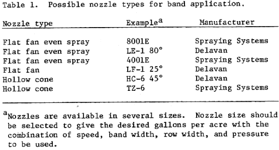Hollow cone nozzles in a vertical position can be used for band application because they produce a spray pattern that is fairly uniform from edge to edge. However, when a hollow cone nozzle is angled from vertical, the spray pattern becomes heavy in the center and light at the edges. Hollow cone nozzles should not be used in the double nozzle band sprayers since two hollow cone nozzles turned at a 45° angle from vertical produce a spray pattern which is not uniform from edge to edge. Two angled flat fan band application nozzles (Table 1) produce a more uniform pattern than two angled hollow cone nozzles in the double nozzle sprayers.