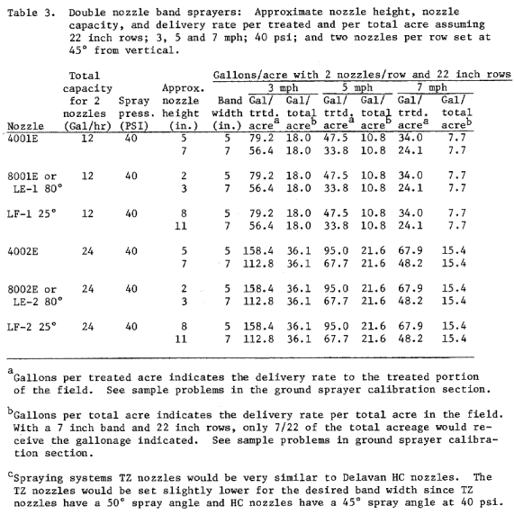 Look in Table 2 and find that-at 7 mph and 40 psi that a nozzle with a delivery rate of 8 gallons/hour will apply 22.6 gallons per treated acre or 5.1 gallons per total acre with a 5 inch band and 22 inch rows at 7 mph. The 22.6 gal/A rate is close enough to the desired 20 gal/A.